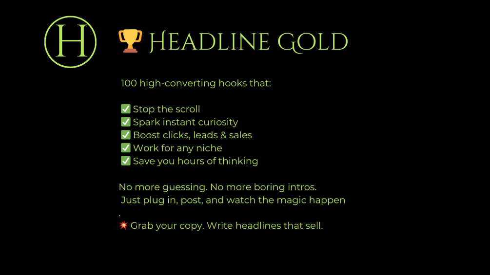 Inside 100 Headline Gold, you’ll get 100 copy-paste headlines that actually convert — built using proven frameworks from legendary marketers and sorted by style to make your life easier. You’ll get curiosity-driven hooks that spark instant intrigue, psychology-based headlines that trigger emotions and tap into human behavior, ROI-style lines inspired by Hormozi that scream value, high-open email subject lines built to crush the inbox, and social ad hooks crafted for Reels, TikToks, and carousels. Every headline is designed to grab attention, trigger emotion, and drive action — whether you're writing emails, landing pages, short-form content, or sales posts. This vault is crafted for creators, coaches, copywriters, and marketers who want more clicks, leads, and sales without wasting time staring at a blank screen. You’ll also get baked-in tips, headline breakdowns, and full permission to swipe, remix, and profit for life. You’re not just buying words — you’re buying the first impression that gets everything else noticed. Just $2. No excuses. Click “I want this” and turn boring headlines into headline gold.
